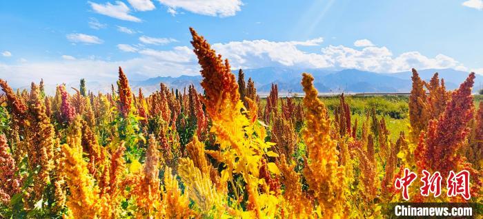 河西農(nóng)場農(nóng)民劉旦智種了30畝藜麥,紅色、白色、黑色的藜麥,在藍(lán)天白云的映襯下,勾勒出一幅高原秋收的美景圖?!敖衲贽见滈L勢(shì)不錯(cuò),一畝地大約600多斤,如果每斤按4塊錢算,一畝地可以收入3000多塊錢,經(jīng)濟(jì)效益很不錯(cuò)。我還種了40多畝枸杞,長勢(shì)跟去年差不多,1斤能賣20多塊錢?!眲⒌┲歉吲d地給記者算著賬。