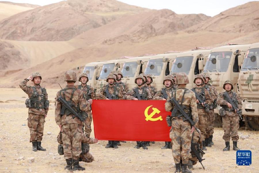 聯(lián)勤保障部隊(duì)汽車運(yùn)輸某團(tuán)一營(yíng)一連在高原執(zhí)行運(yùn)輸任務(wù)時(shí),利用休息間隙組織官兵重溫入黨誓詞(5月10日攝)。新華社發(fā)