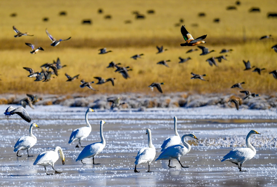 “碌曲縣依托“黃補(bǔ)”區(qū)項(xiàng)目先后將湖邊的尕海鎮(zhèn)、鎮(zhèn)屬機(jī)關(guān)單位遷移出了核心區(qū),將居住在尕海湖邊的牧民群眾實(shí)施了整村搬遷,有效減緩了對(duì)侯鳥(niǎo)的干擾。”甘肅尕海則岔國(guó)家級(jí)自然保護(hù)區(qū)管護(hù)中心尕海保護(hù)站站長(zhǎng)香毛吉說(shuō),隨著尕海濕地生態(tài)的持續(xù)改善,為大天鵝提供了穩(wěn)定的越冬水位、豐富的濕地食物,在尕海境內(nèi)越冬的大天鵝數(shù)量逐年增加。