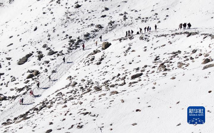 1月1日,登山愛好者攀登崗什卡雪峰(無人機(jī)照片)。新華社記者 張龍 攝