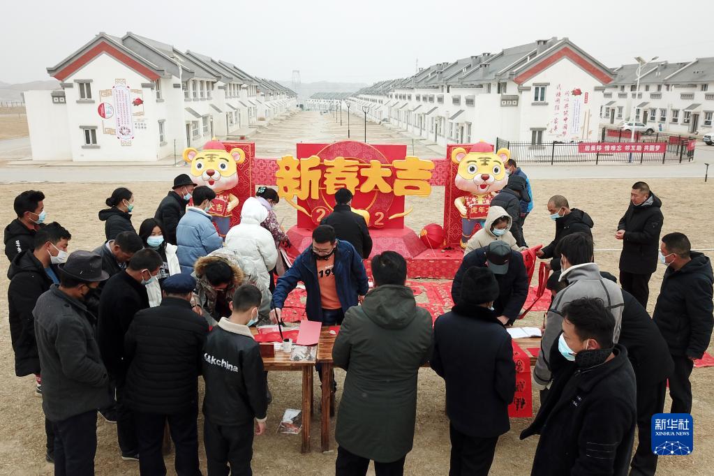 1月25日,在蘭州新區(qū)舟曲避險搬遷安置點(diǎn),舟曲地質(zhì)災(zāi)害避險搬遷第一臨時黨支部組織書法家給搬遷群眾送春聯(lián)(無人機(jī)照片)。新華社記者 范培珅 攝