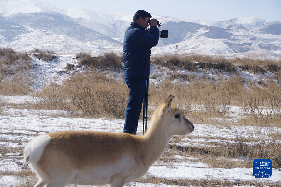 2月11日,吳永林正在和普氏原羚“東東”一起在保護(hù)站內(nèi)巡查。新華社記者 周盛盛 攝