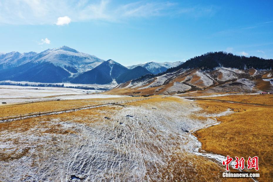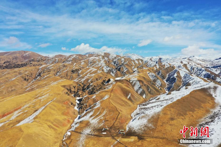 一場春雪過后,青海省海北藏族自治州祁連山國家公園青海片區(qū)群山被白雪覆蓋,云霧繚繞,金色的草場、潔白的羊群和蔚藍的天空相映成趣,美不勝收。馬銘言 攝