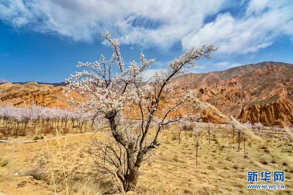 神奇的丹霞峽谷和一樹樹梨花構成一幅色彩艷麗的油畫。新華網 宋忠勇 攝