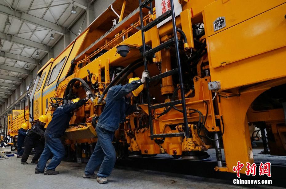 圖為職工正在檢修大型養(yǎng)路機(jī)。馬銘言 攝