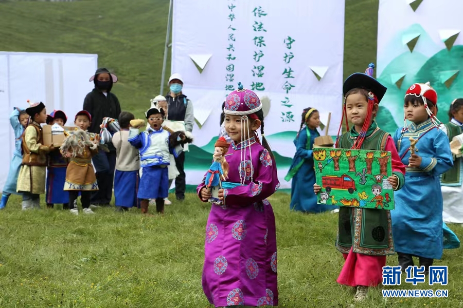 自2019年起,青海洮河源國家濕地公園每年夏季都會組織周邊幼兒園及中小學生開展科普教育活動,向學生們講授濕地基礎知識、了解植物和野生動物知識等,在體驗自然奧秘和美麗的同時,培養(yǎng)學生愛護環(huán)境、保護生態(tài)的意識。正值盛夏,這里天空湛藍、水草豐美。科普宣教員多杰康卓在給來自河南縣賽龍鄉(xiāng)中心寄宿制完全小學五年級的學生們上生態(tài)課。 “濕地被譽為‘地球之腎’,是生物多樣性富集的生態(tài)系統(tǒng)和人類重要的生存環(huán)境之一,具有涵養(yǎng)水源、凈化水質、維護生物多樣性等重要的生態(tài)功能?!倍嘟芸底拷o大家講授濕地環(huán)保知識,也與學生們一同分享大家創(chuàng)作的環(huán)保主題作品。