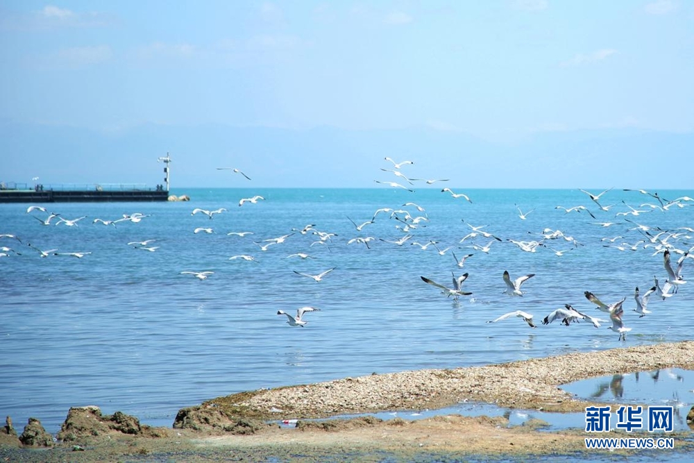 水面上,棕頭鷗隨波蕩漾;湖水里,青海湖裸鯉悠閑游弋。新華網(wǎng) 馬洪婷 攝