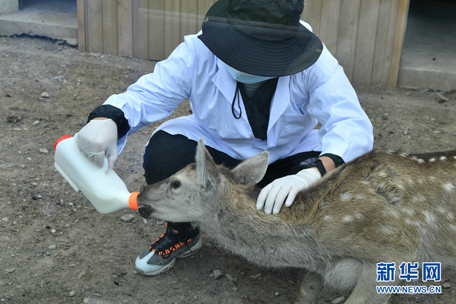 在祁連山國家公園青海片區(qū)野生動物救護(hù)繁育中心內(nèi),工作人員正在給馬鹿喂奶。新華網(wǎng) 卡婭梅朵 攝