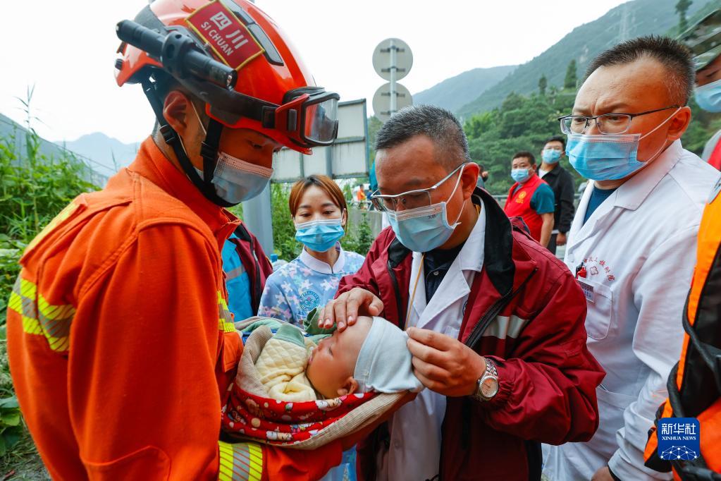 9月6日,阿壩森林消防支隊(duì)汶川大隊(duì)隊(duì)員張自立將一名從瀘定縣得妥鎮(zhèn)灣東村疏散出來的2個(gè)月大的嬰兒,交給瀘定縣人民醫(yī)院醫(yī)生。新華社記者 沈伯韓 攝