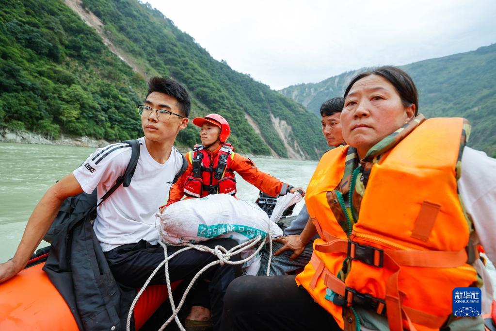 9月6日,從瀘定縣得妥鎮(zhèn)灣東村疏散出來的村民乘坐橡皮艇向外疏散。新華社記者 沈伯韓 攝