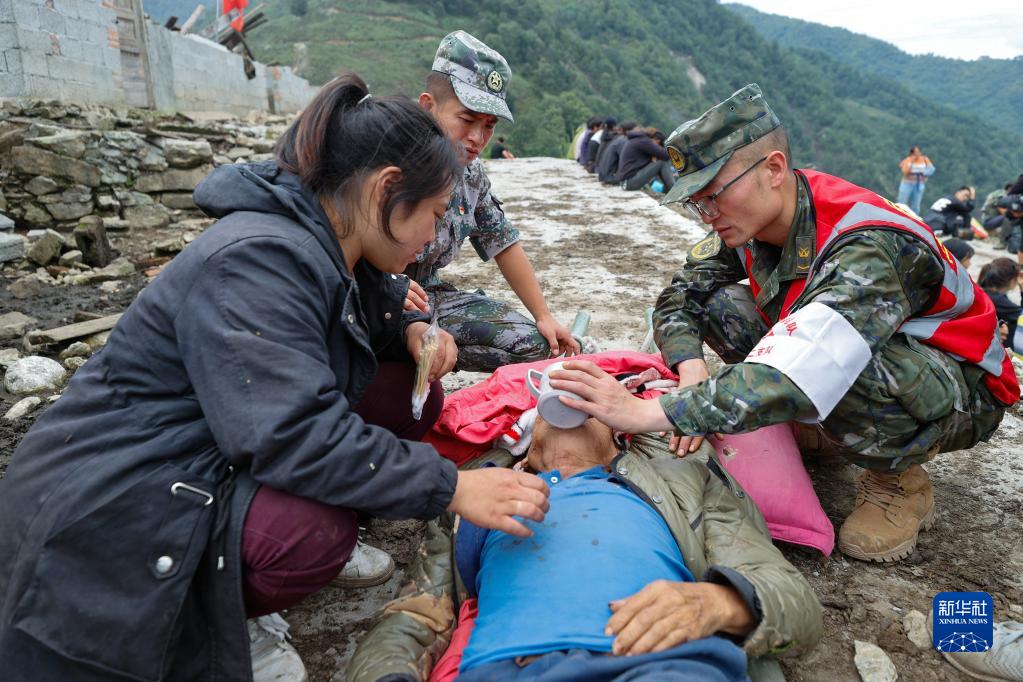 9月6日,救援人員給一名從瀘定縣得妥鎮(zhèn)灣東村疏散出來的受傷村民喂水。新華社記者 沈伯韓 攝