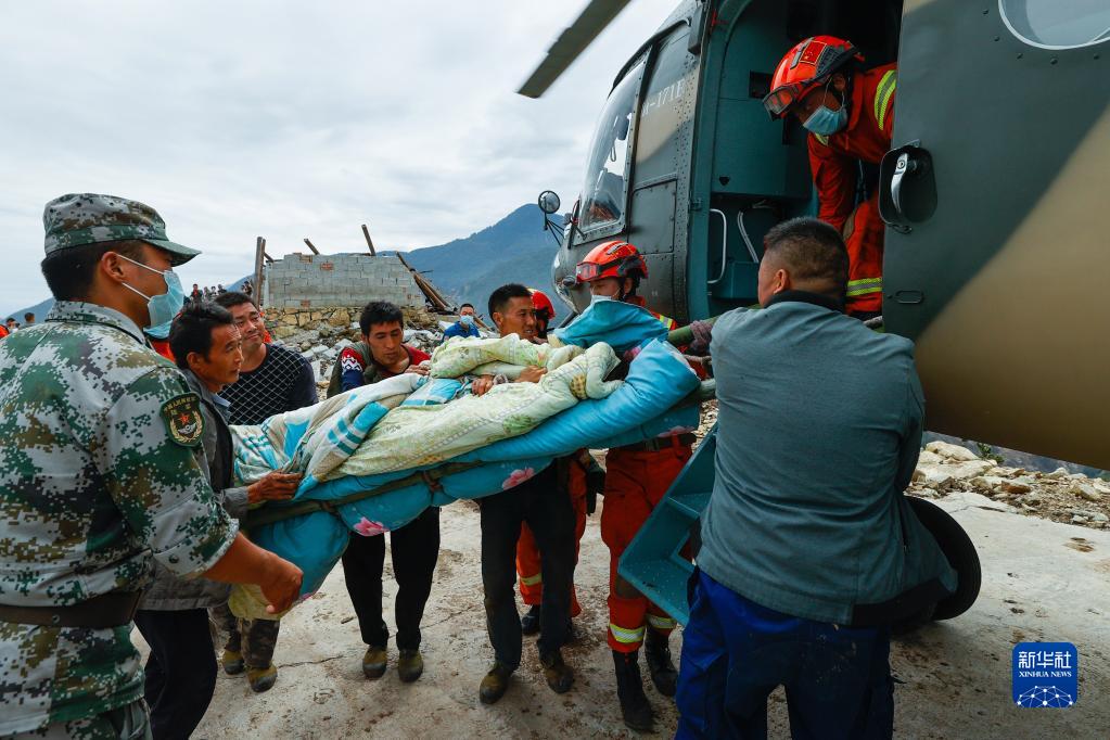 9月6日,救援人員抬著一名從瀘定縣得妥鎮(zhèn)灣東村疏散出來的受傷村民,準(zhǔn)備通過直升機(jī)將其運(yùn)出。新華社記者 沈伯韓 攝