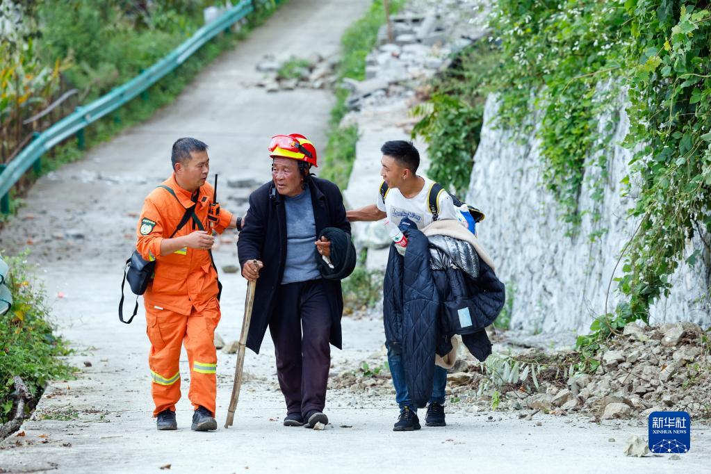 9月6日,救援人員幫助瀘定縣得妥鎮(zhèn)灣東村村民向外疏散。新華社記者 沈伯韓 攝