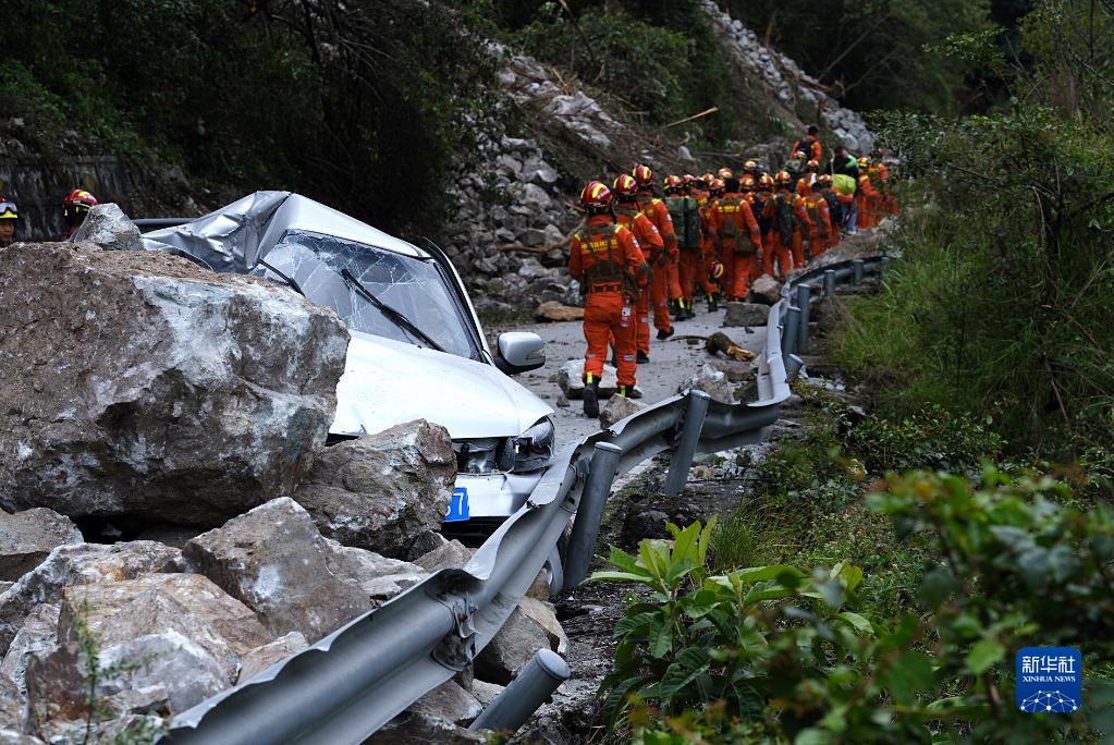9月6日,在瀘定縣磨西鎮(zhèn)共和村,救援人員徒步進入災區(qū)救援。新華社 程雪力 攝