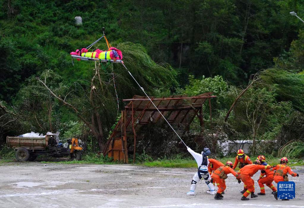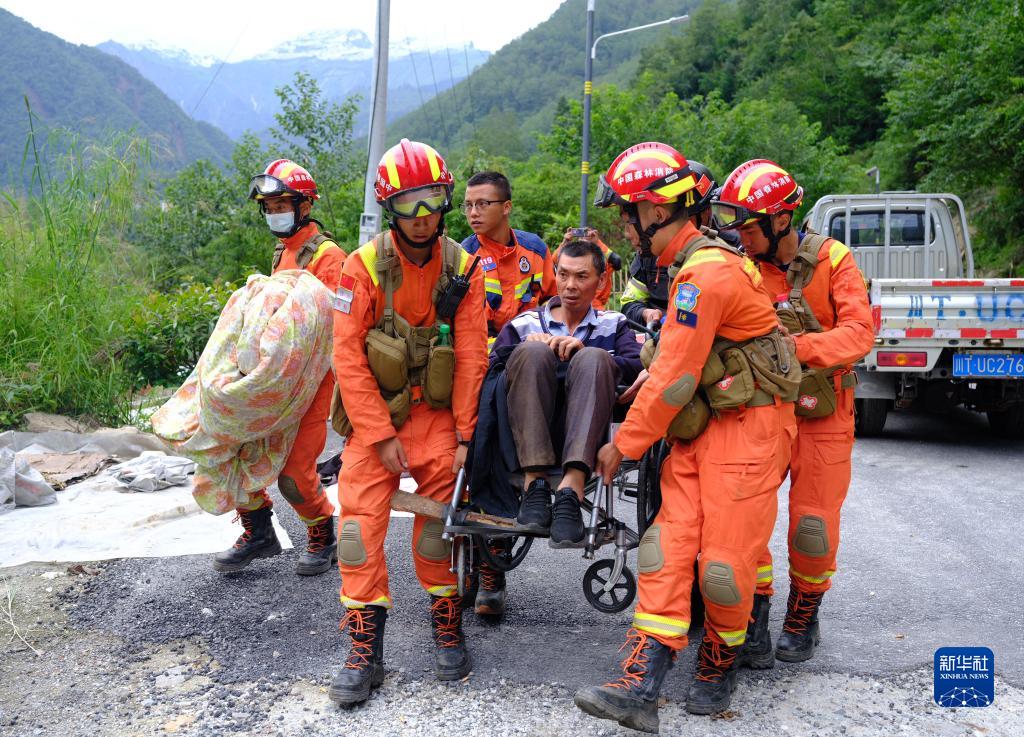 9月6日,在瀘定縣磨西鎮(zhèn)共和村,救援人員轉移傷員。新華社 程雪力 攝
