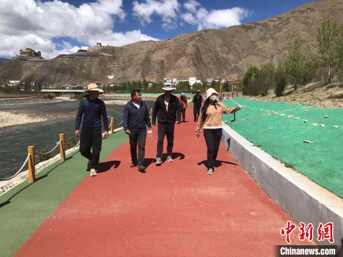 圖為寧樣(右一)檢查玉樹市樹木生長情況。玉樹市委宣傳部供圖