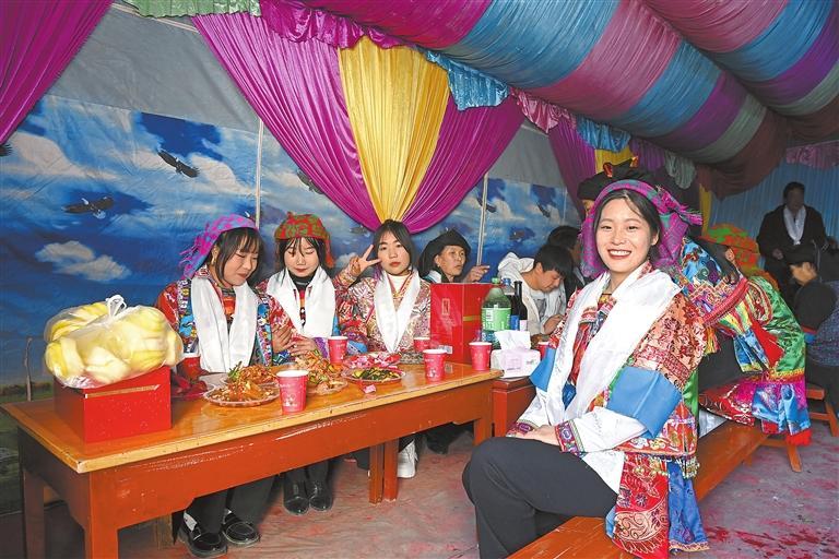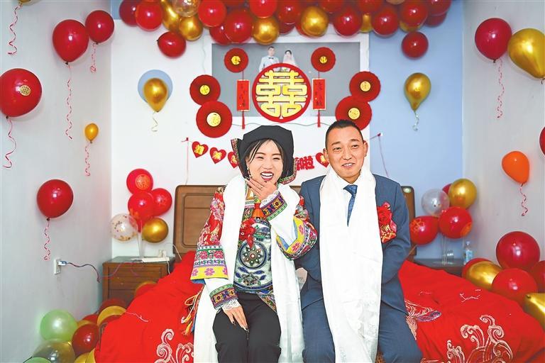 在熱鬧的鞭炮聲和一聲聲祝福中,一場喜慶的藏族婚禮在新康村舉行。搬出大山,遠(yuǎn)離地災(zāi)危險區(qū),新康村村民本永龍在寬敞整潔的新家里迎娶他最美麗的新娘。