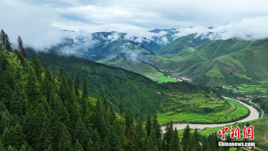 7月11日,一場(chǎng)降雨過后,云霧如潔白的哈達(dá)飄落在青海省果洛藏族自治州班瑪縣瑪可河國家森林公園山頭,與樹木、河流、梯田相互映襯,自然風(fēng)景美如畫。[詳細(xì)]