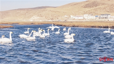 大天鵝在河面上翩翩起舞 若爾蓋上演高原“天鵝湖”