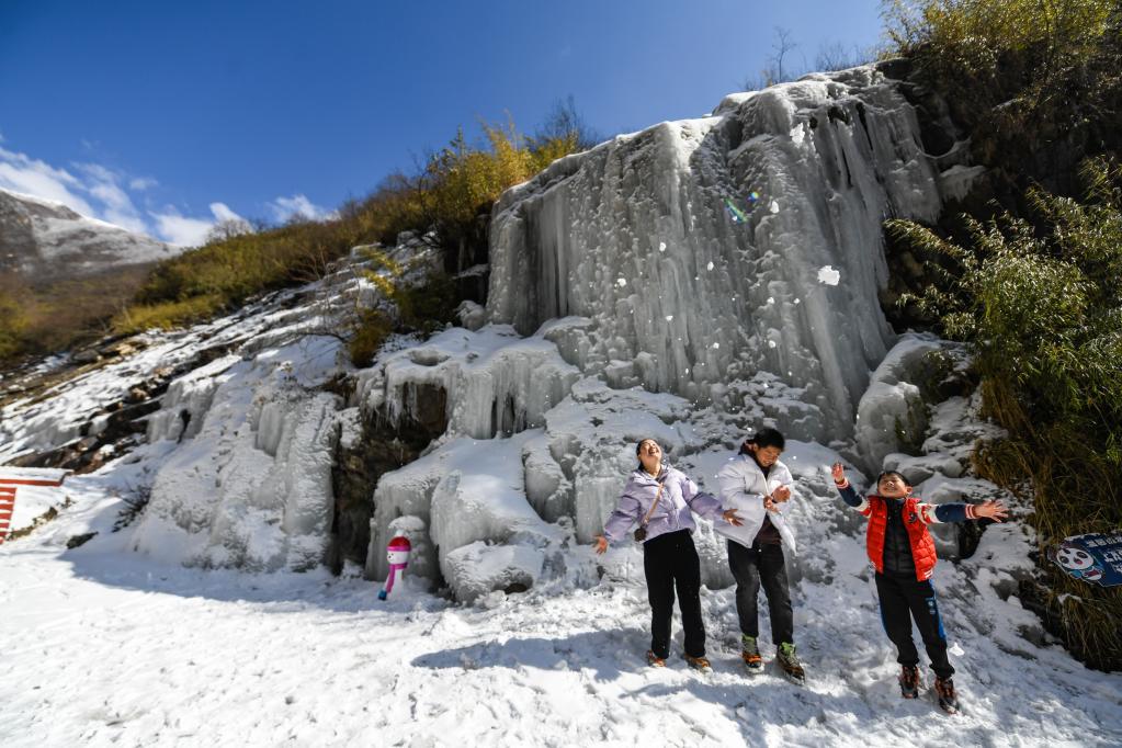 2月9日,來自成都的游客在克枯村的冰瀑下玩雪。新華社記者 王曦 攝