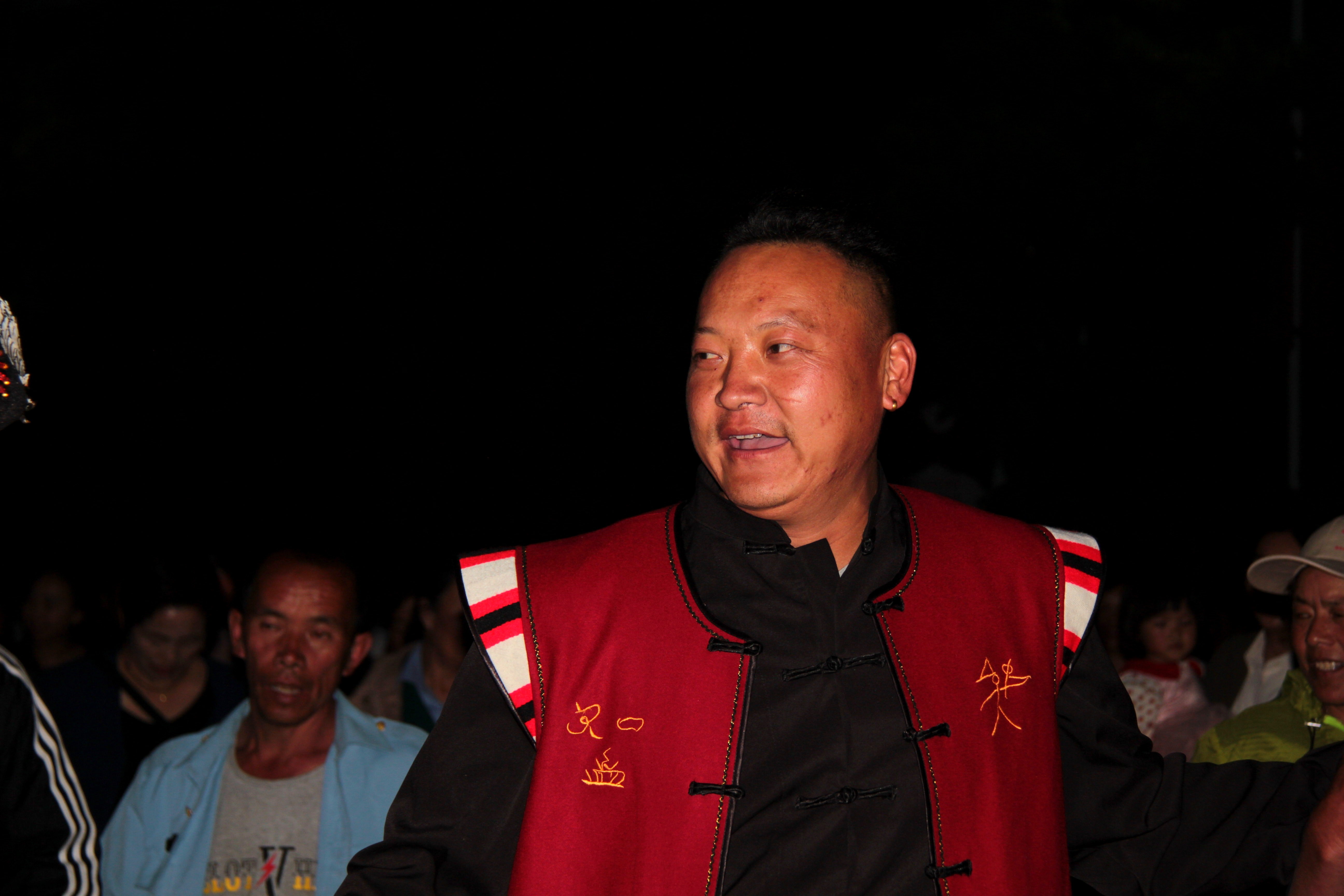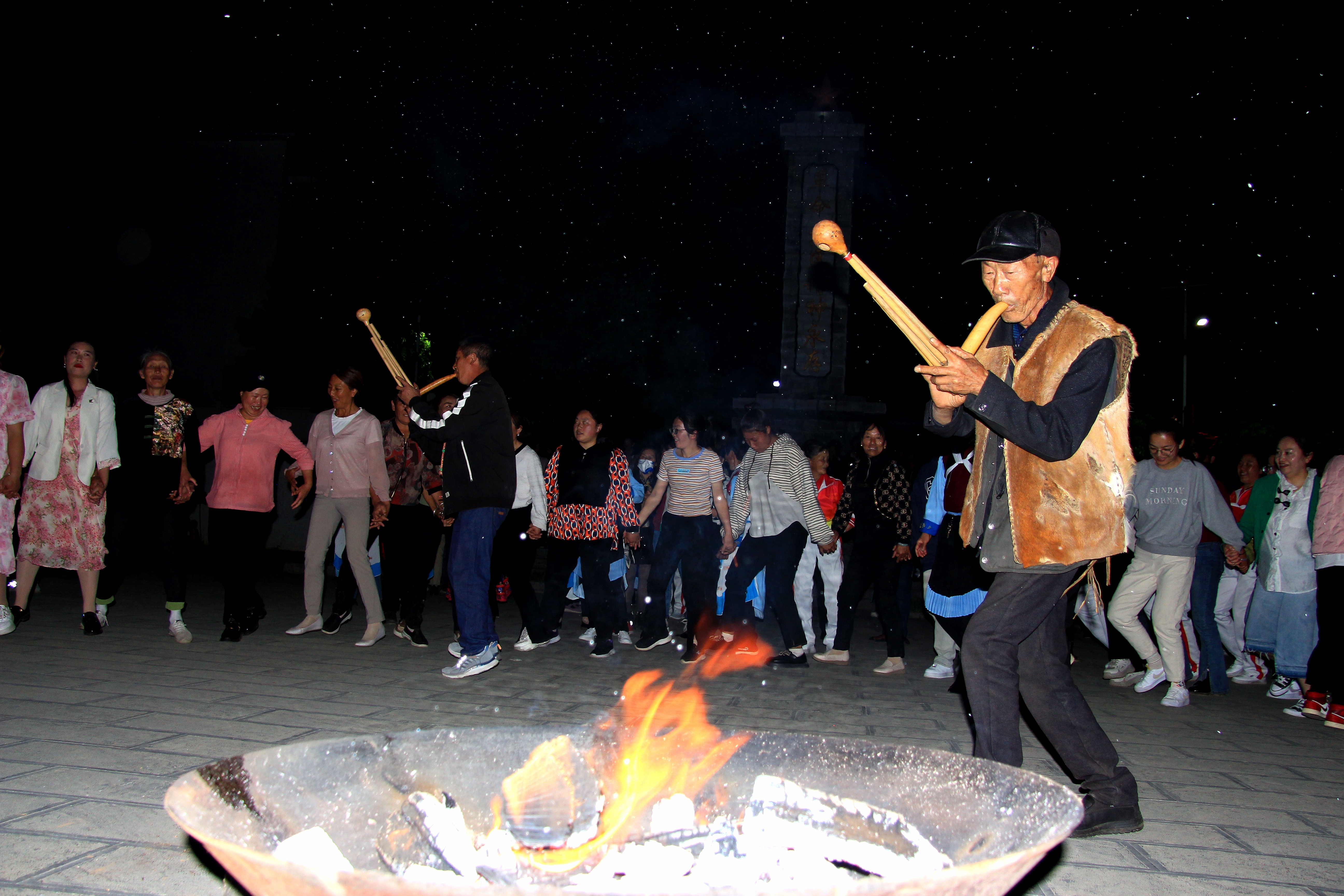 打跳開始了,不斷有圍觀群眾參與到打跳當(dāng)中,打跳選手手牽手把篝火圍了三四圈,篝火的映照下,大家臉上的笑容又燦爛了幾分。打跳歌曲從勁爆葫蘆絲換到納西三部曲又換到大蠻調(diào),換了無數(shù)首,而參與群眾仿佛不知疲倦一直激情打跳著,現(xiàn)場(chǎng)非?;馃?。