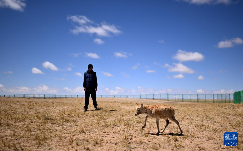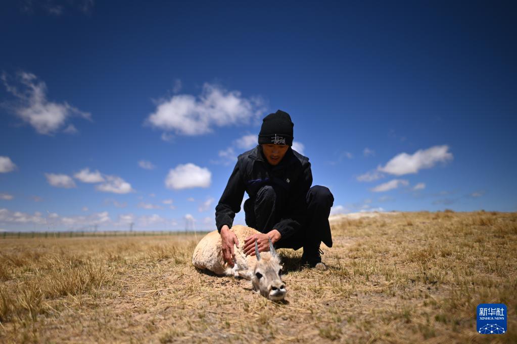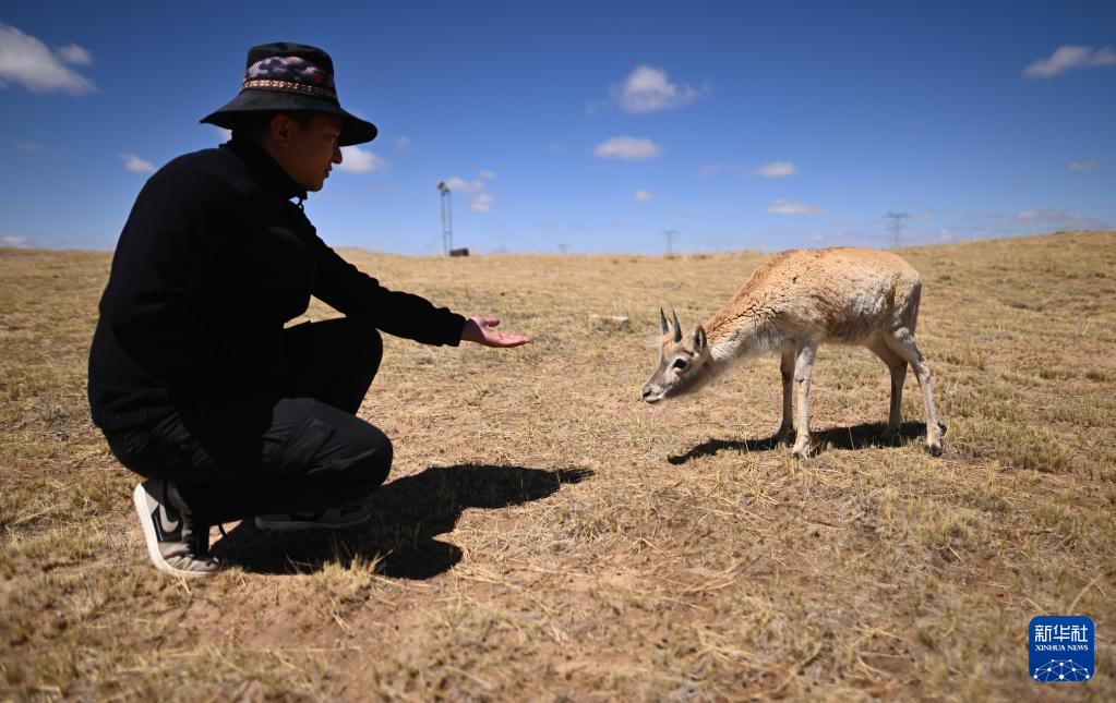在可可西里國家級自然保護區(qū)索南達杰保護站,巡山隊員扎西桑周在野生動物救助中心內(nèi)與一只被救助的小藏羚羊互動(5月30日攝)。 新華社記者 張宏祥 攝