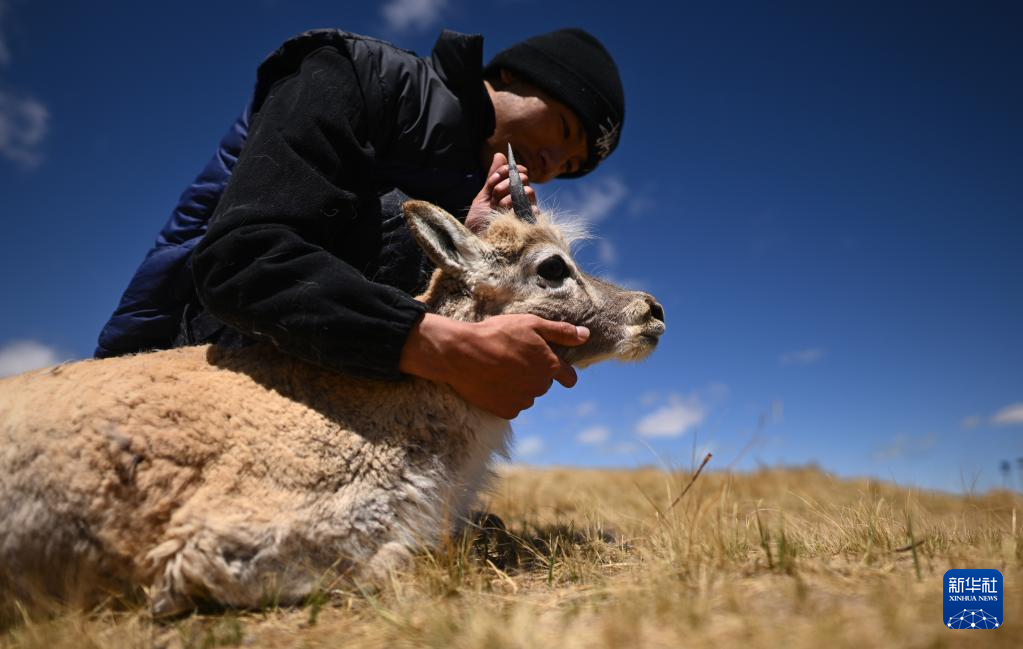 在可可西里國家級自然保護區(qū)索南達杰保護站,巡山隊員才文多杰在野生動物救助中心查看被救助的藏羚羊身體狀況(5月30日攝)?!⌒氯A社記者 張宏祥 攝
