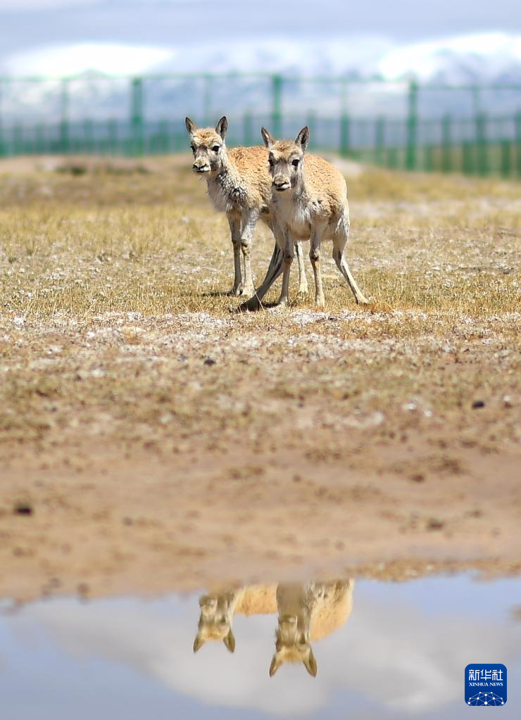 在可可西里國家級自然保護區(qū)索南達杰保護站,兩只藏羚羊在野生動物救助中心活動(5月30日攝)?!⌒氯A社記者 薛玉斌 攝