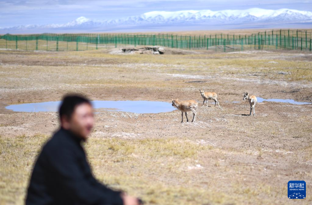 5月30日,在可可西里國家級自然保護區(qū)索南達杰保護站,巡山隊員才文多杰和藏羚羊在一起?!⌒氯A社記者 薛玉斌 攝