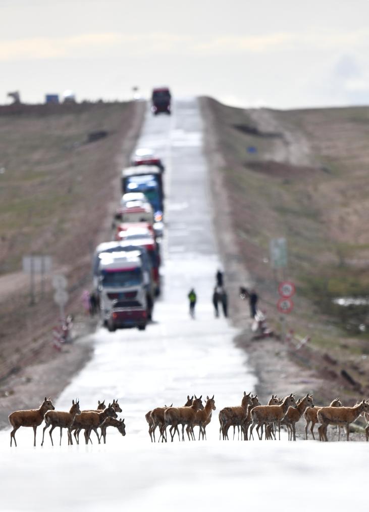 7月28日,一群藏羚羊通過青藏公路前往三江源地區(qū)的棲息地。新華社記者 張宏祥 攝