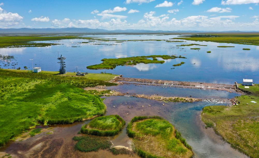 這是在四川省阿壩藏族羌族自治州若爾蓋縣花湖拍攝的生態(tài)堤壩。新華社記者 王曦 攝