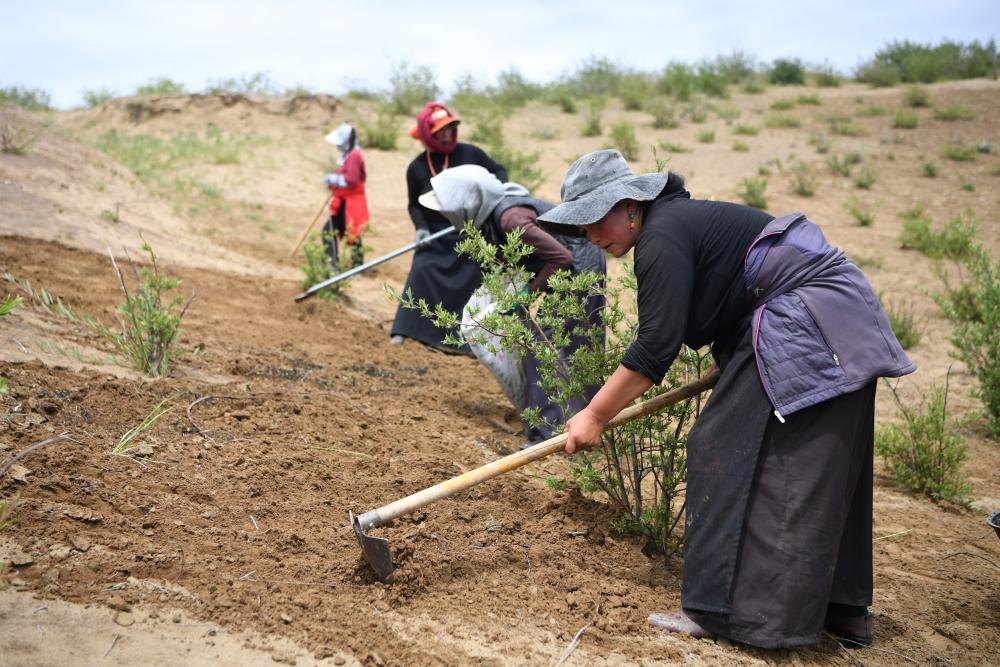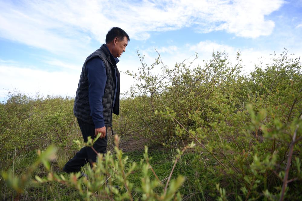 多年投身沙化草原治理的牧民卓瑪加布在黃河瑪曲段干流沿岸一處沙化草原治理點查看他參與種植的植被生長情況(7月5日攝)。新華社記者 陳斌 攝