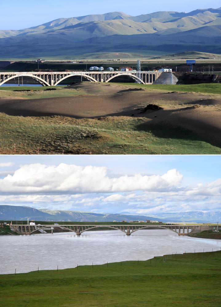 拼版照片:上圖為2011年6月10日在甘南藏族自治州瑪曲縣城郊的黃河大橋附近拍攝的大面積沙化退化草場(新華社記者 聶建江 攝);下圖為2023年7月6日在甘南藏族自治州瑪曲縣城郊的黃河大橋附近拍攝的沙化退化草場已經(jīng)復(fù)綠(新華社記者 陳斌 攝)。