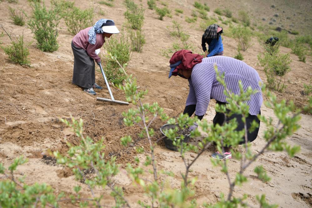 牧民在瑪曲縣歐拉鎮(zhèn)黃河沿岸一處沙化草原治理點補種草籽(7月6日攝)。新華社記者 方欣 攝