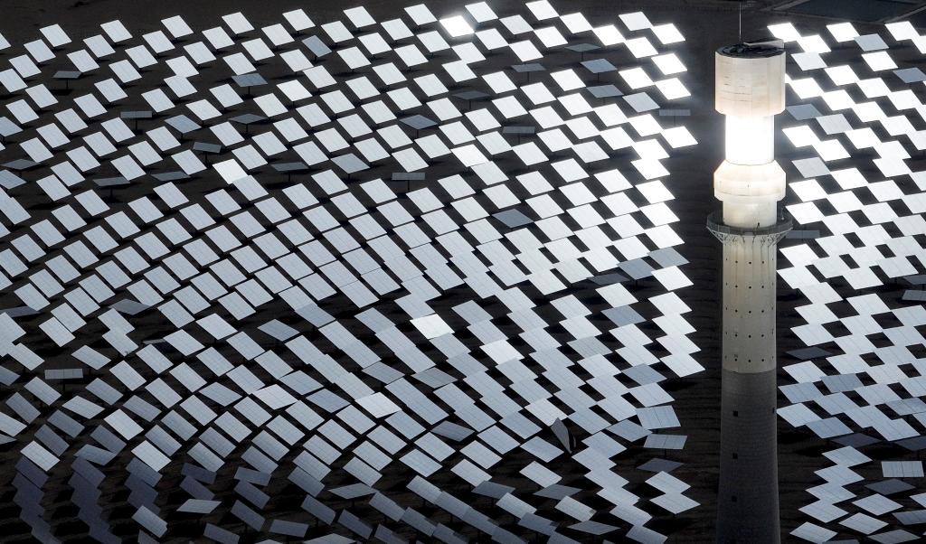 蔚藍(lán)色的光伏板在陽光照射下熠熠生輝,光能便轉(zhuǎn)化成源源不斷的電能;風(fēng)力發(fā)電機(jī)的葉片迎風(fēng)飛轉(zhuǎn),風(fēng)被“捕捉”進(jìn)一條條輸電線;百米高的吸熱塔和“鏡子海洋”組成熔鹽塔式光熱電站,科技感與綠色減碳有機(jī)結(jié)合……