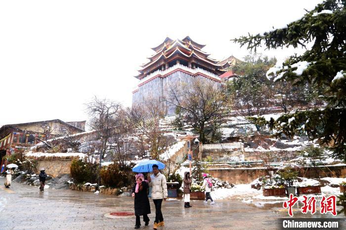圖為游客游覽雪中的獨克宗古城。鄒鵬 攝