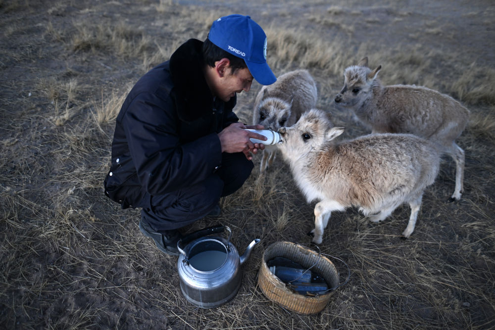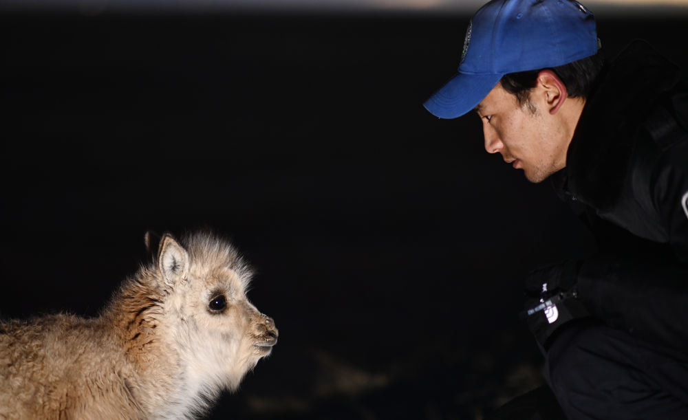 可可西里巡山隊員才文多杰在索南達(dá)杰保護(hù)站內(nèi)給被救助的藏羚羊幼仔喂奶(1月18日攝)。新華社記者 張宏祥 攝