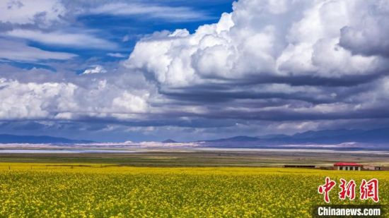 資料圖為航拍青海湖邊的萬畝油菜田。海南州委宣傳部供圖