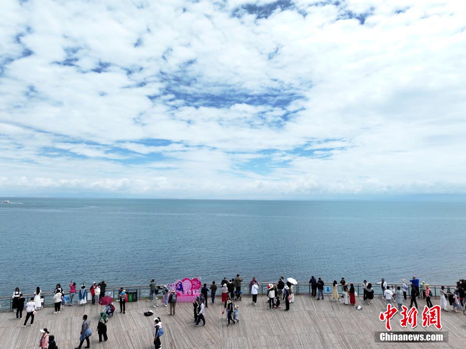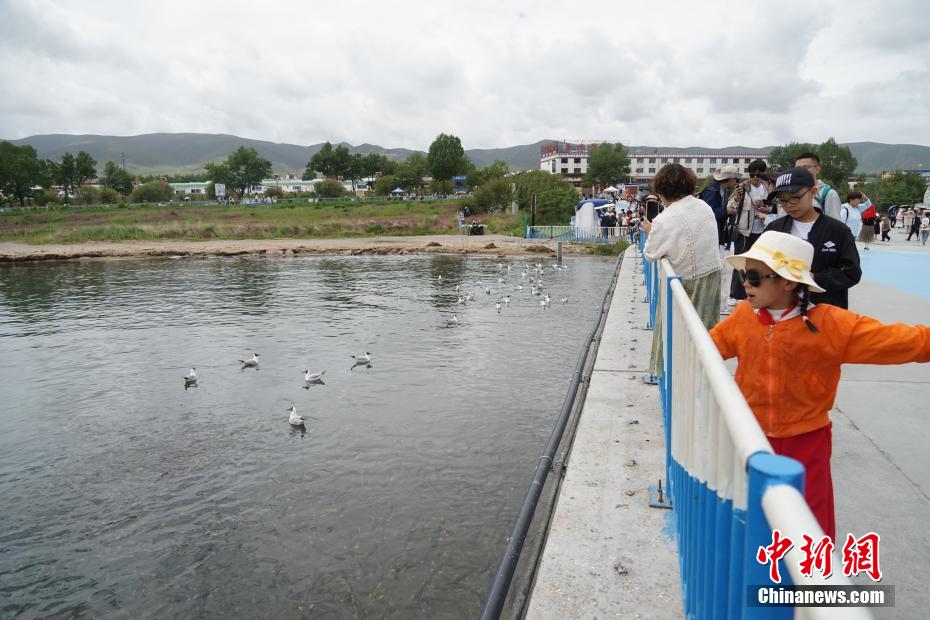 7月8日,游客在青海省海南藏族自治州共和縣青海湖二郎劍景區(qū)內(nèi)觀賞“魚鳥共生”的生態(tài)景象。中新社記者 馬銘言 攝