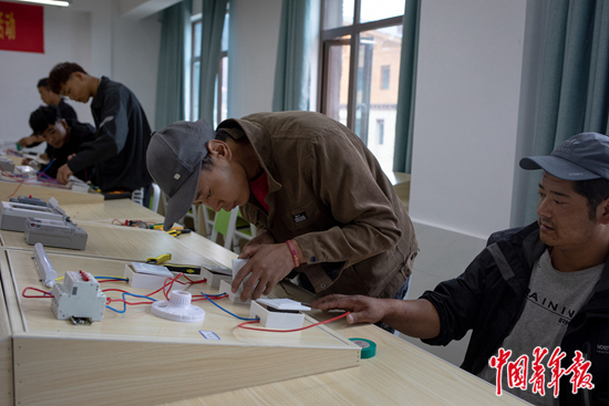 29歲的扎西才登(右二)在電工教室練習(xí)線路組裝。他的家庭是貧困戶,他因聽力障礙,沒有外出打工。村里介紹他來林芝市技工學(xué)校學(xué)習(xí),學(xué)成后可以推薦進入企業(yè)就業(yè)。中青報·中青網(wǎng)記者 李雋輝 攝