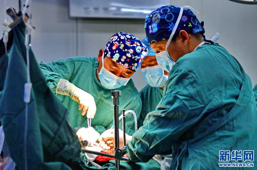 在拉薩市人民醫(yī)院第二手術(shù)室,主治醫(yī)師醫(yī)生扎西云旦為包蟲病患者做手術(shù)(2020年12月31日攝)。新華社記者 張汝鋒 攝