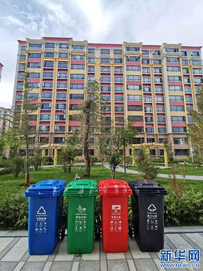 拉薩一新建成小區(qū)內(nèi)擺放的垃圾分類(lèi)回收桶(2020年9月6日攝)。新華社記者 普布扎西 攝