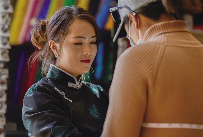 “老板,你家還有這款藏裝嗎?我想要一款。”在該店內(nèi),市民卓嘎拿出手機,指著格桑措姆錄制的藏裝短視頻說道?!坝械?,這是我們今年推出的新款,是對傳統(tǒng)的藏裝進行了改良,主要是體現(xiàn)在領(lǐng)口處,改良后的藏裝對領(lǐng)口部位進行了復古簡約化設(shè)計,使其兼具美觀性與舒適性,再搭配一個‘卡烏’堪稱完美?!备裆4肽方榻B道。