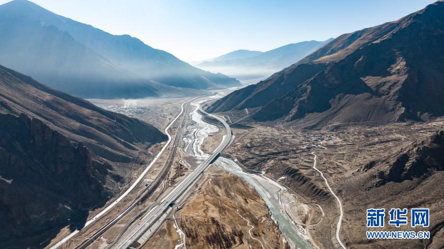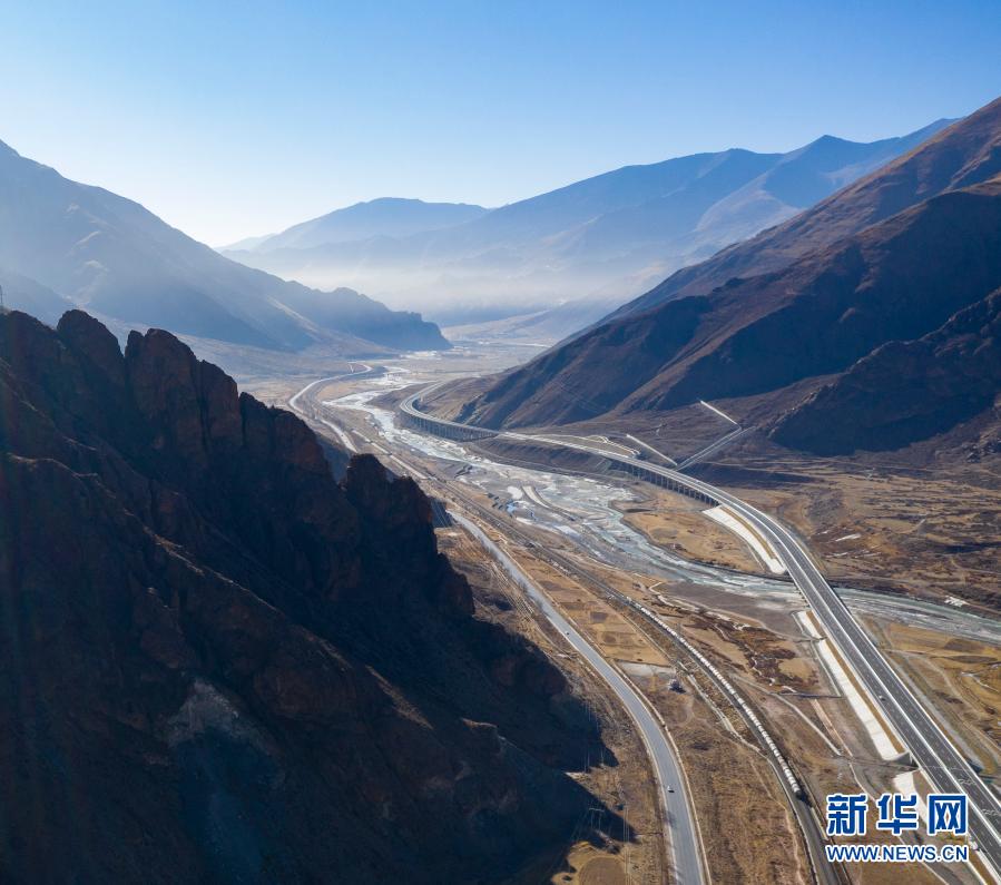 這是拉薩至那曲間的交通線路(1月28日攝,無人機(jī)照片)。從左到右依次為109國道、青藏鐵路、高等級公路。新華社記者 孫非 攝