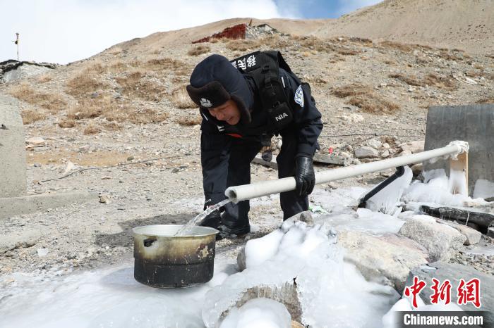 珠峰大本營執(zhí)勤點(diǎn)民警正在取水做飯。彭維熙 攝