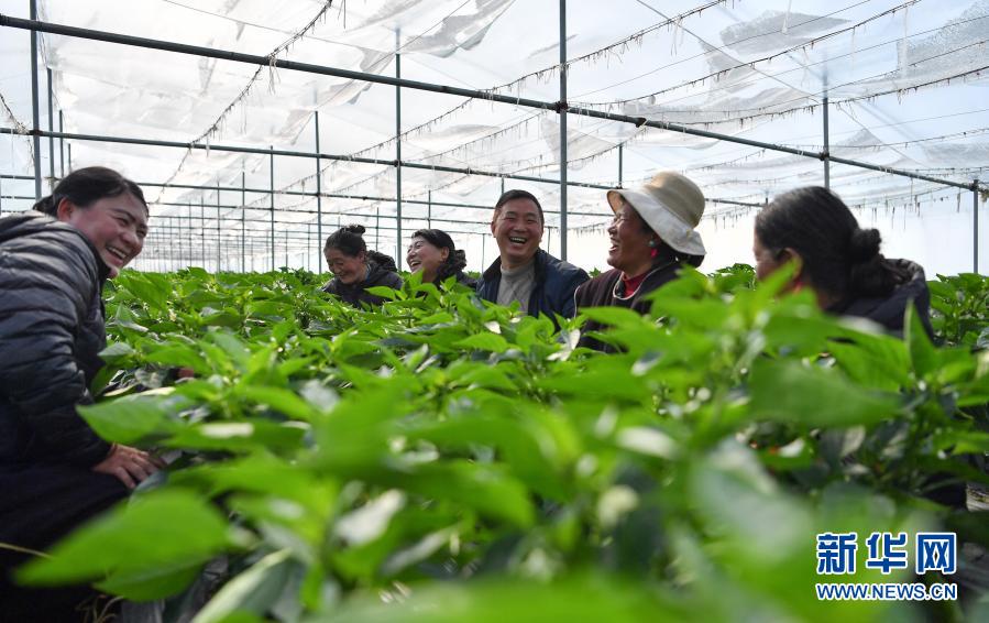 陳千(中)和種植戶在大棚里查看蔬菜長(zhǎng)勢(shì)(2月25日攝)。新華社記者 晉美多吉 攝