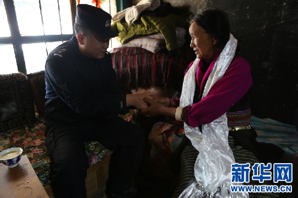 西藏出入境邊檢總站執(zhí)法調(diào)查支隊(duì)四隊(duì)民警在卓瑪老人家中慰問(3月4日攝)。新華網(wǎng)發(fā) 羅云川攝