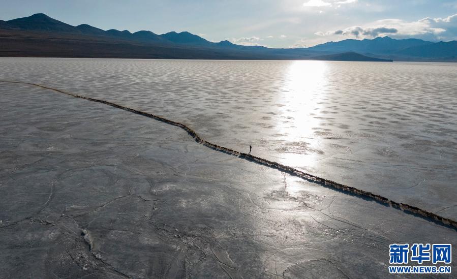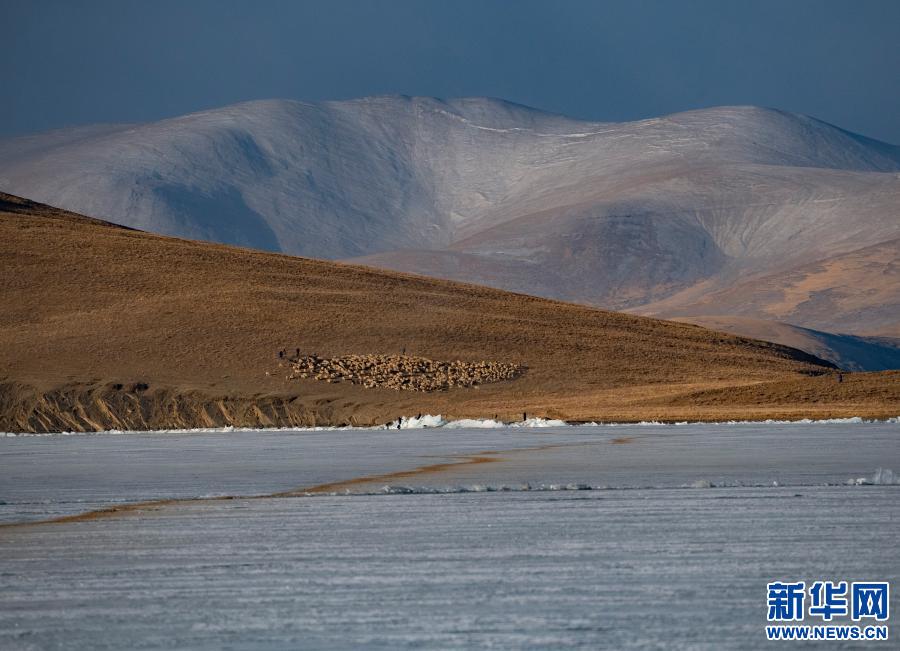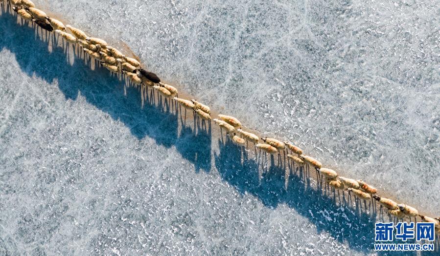 牧羊人趕著羊群,太陽趕著牧羊人。不停向前的羊群在冰湖上拉出長長的隊形。