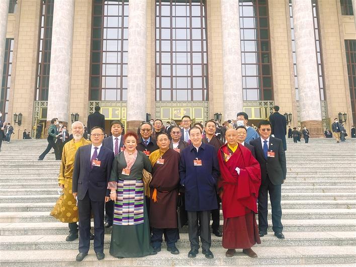 圖為3月10日下午,全國(guó)政協(xié)十三屆四次會(huì)議閉幕。圖為住藏全國(guó)政協(xié)委員在會(huì)場(chǎng)外合影。旦增赤列 攝