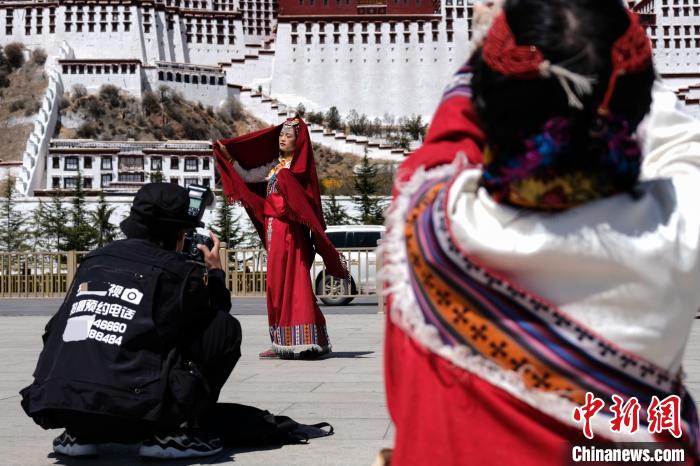 游客在拉薩布達(dá)拉宮廣場體驗藏式元素服裝。江飛波 攝